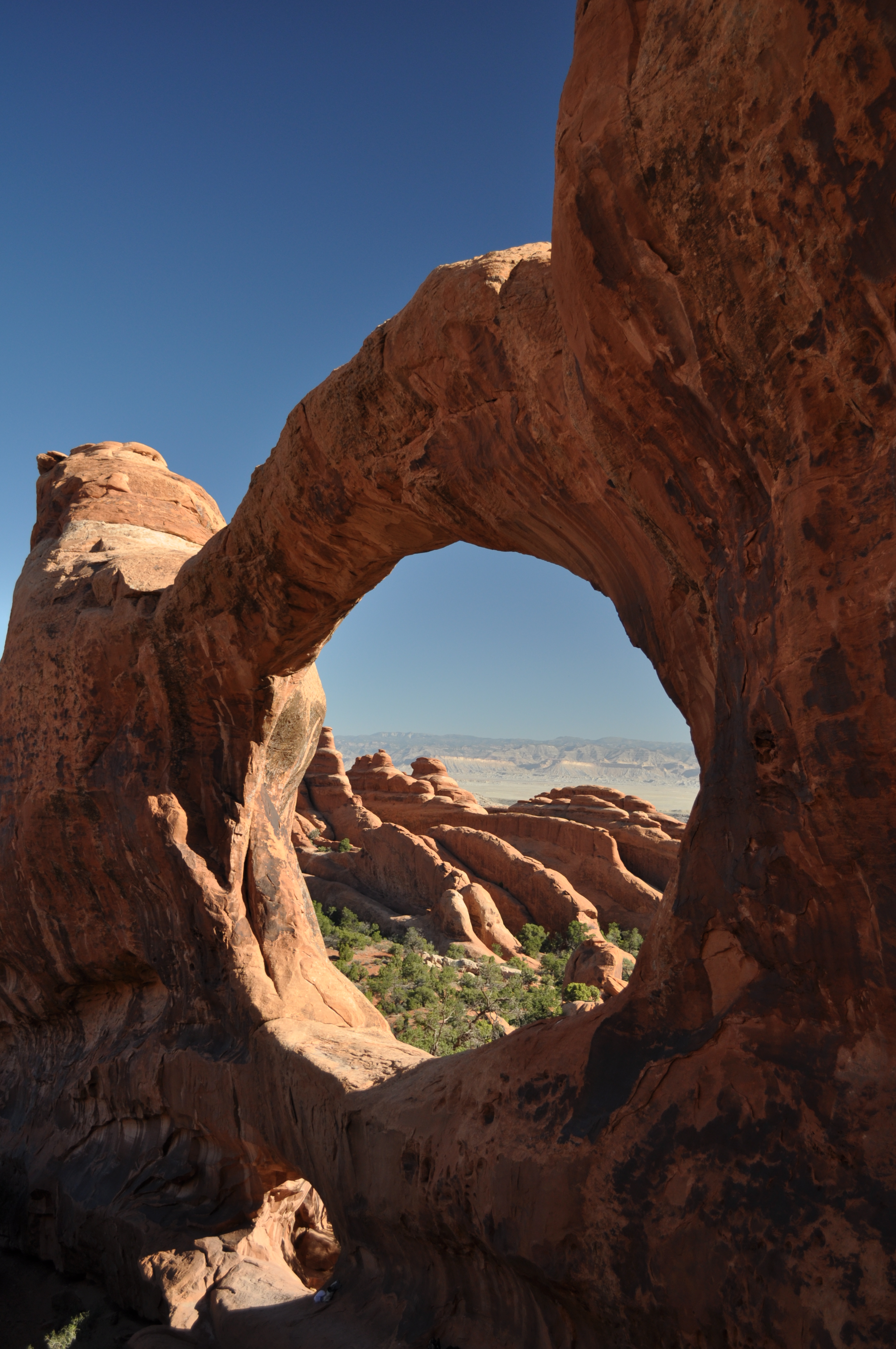 After returning to the main trail, you will continue another 0.8 miles to Double O Arch. Along the way, you will need to traverse along the top of a narrow rock fin for about 100 meters. It isn’t too bad, but this may be a place where children could feel apprehensive, due to height. After crossing the fin, you’ll have a nice overlook of the desert landscape to the northeast. The dark arch in the distance is Black Cave Arch.