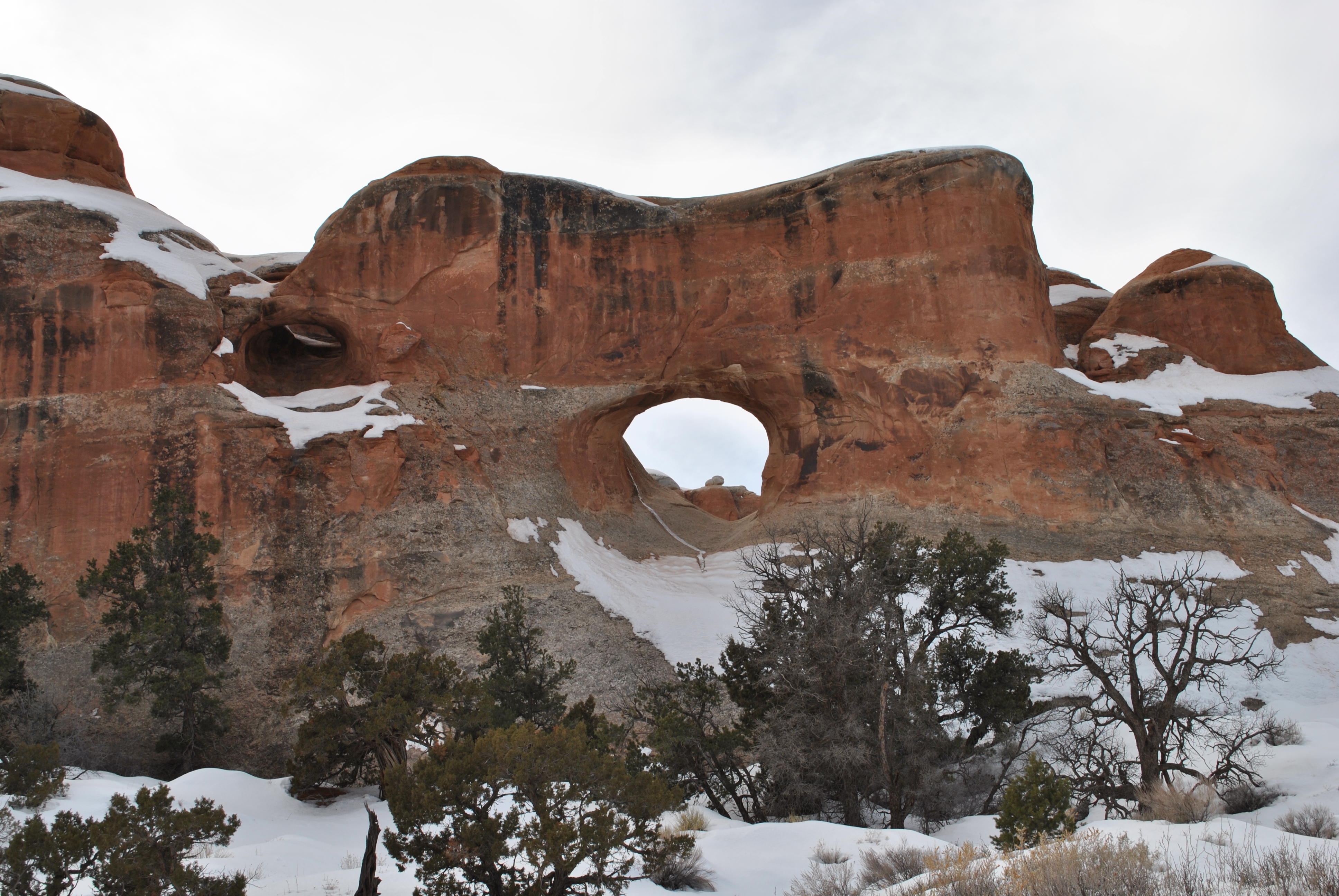 After passing the overlook it’s just a short distance to Double O Arch. It is composed of two arches just like Partition Arch, however with Double O Arch, a large arch is on top of a small arch. The best photographs of these arches come after climbing through the bottom arch and walking up and behind them and trying to squeeze both into the frame.