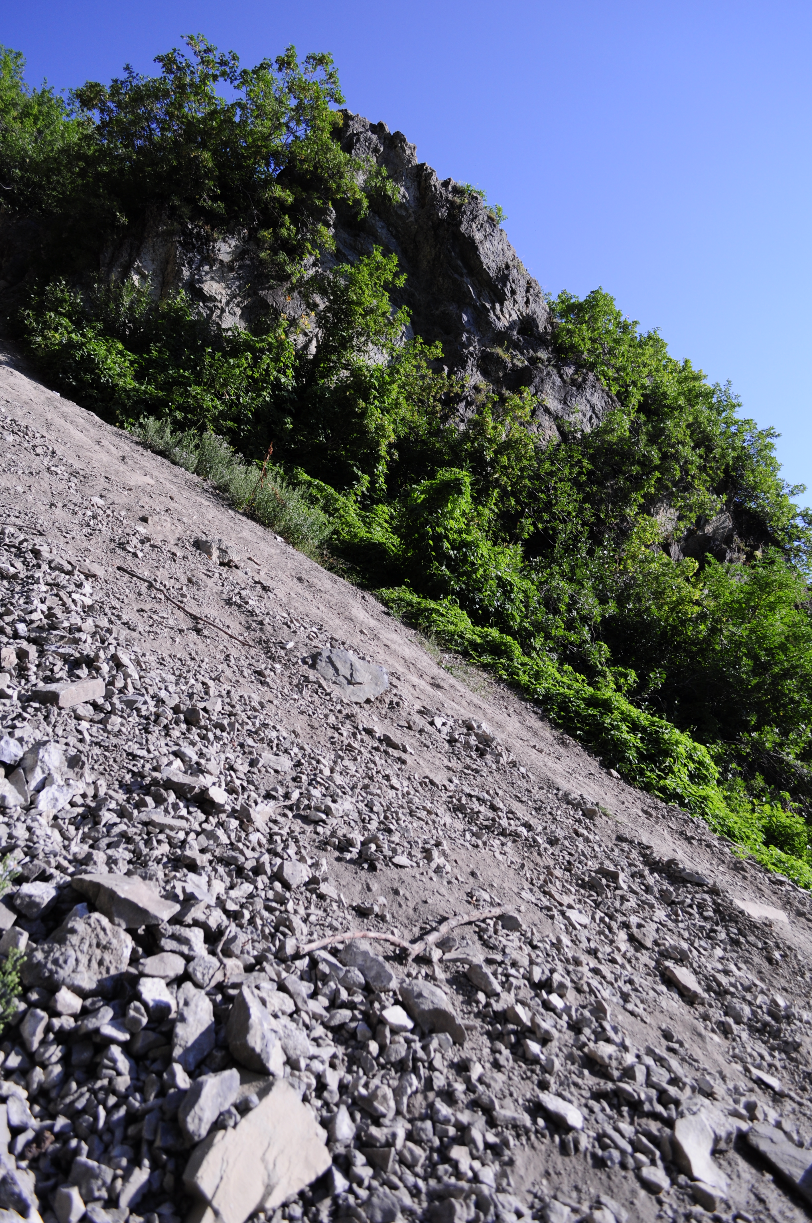 Between the rock outcropping and the falls is a steep slope of scree. It almost looks like the trail goes down that way, but it doesn’t. The first time the author hiked to Stewart Falls, he went down this way thinking that it was the trail. It was not. He still has a couple of scars to prove it.
